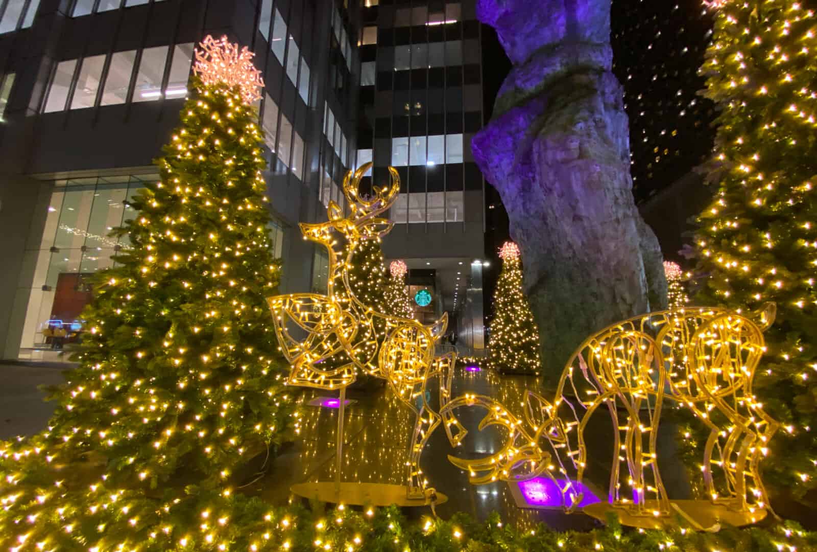 To maintain brand consistency, American Christmas crafted custom greenery in Paramount Group’s signature navy color, creating a cohesive visual experience from exterior to interior. The installation included two 14-foot Christmas trees, four 6-foot wreaths, two 12-foot trees placed inside the exterior fountains, and over 500 feet of garland adorning the building’s façade. Altogether, the display featured an impressive 252,398 individual lights, illuminating the space with festive brilliance.