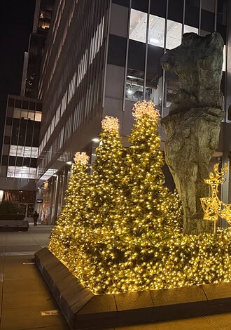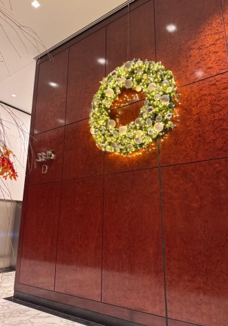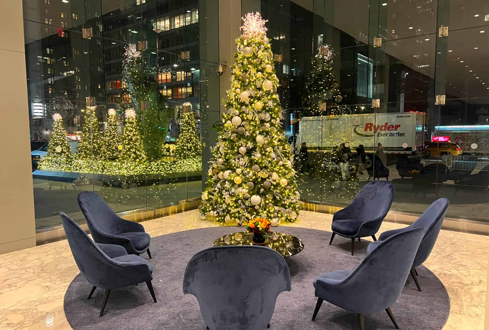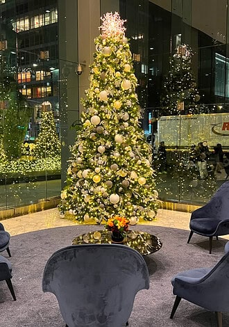 The installation featured custom Christmas decorations across the building’s exterior fountains, awning, main lobby, and elevator banks. A unique challenge was designing décor that complemented Jim Dine’s “Looking Toward the Avenue” sculptures, which have graced the property since 1989. These Venus de Milo-inspired statues required a thoughtful and artistic approach to ensure the holiday elements enhanced their presence without overpowering them.